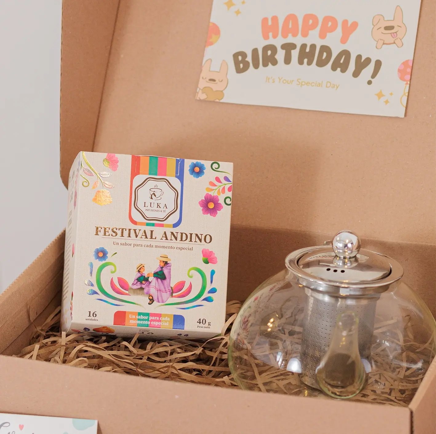 Taza y tetera de porcelana con caja de 16 infusiones. Sabores variados